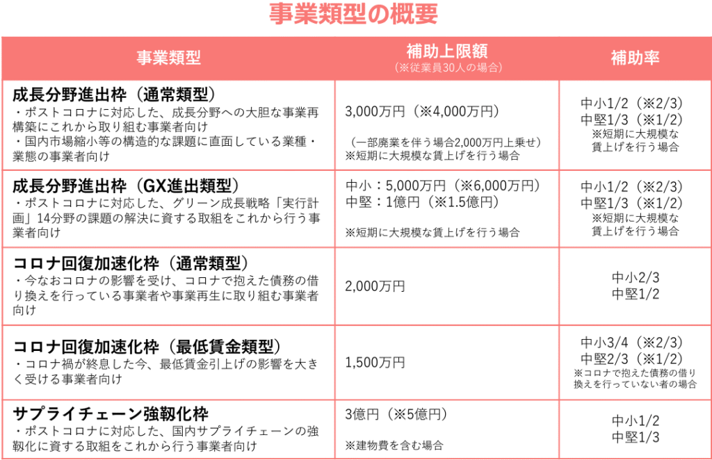 事業類型は、成長分野進出枠とコロナ回復加速化枠、サプライチェーン強進化枠の3枠があります。
